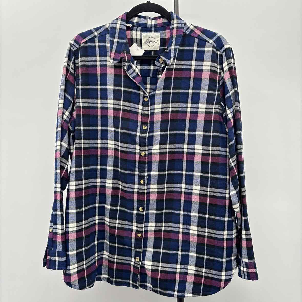 navy/purple/black/white plaid button up flannel