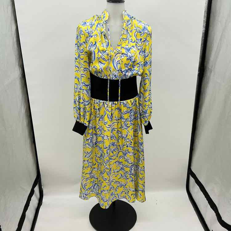 yellow/blue/white floral dress w/ faces, black waist/cuffs & cream slip